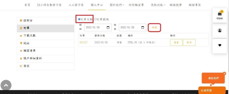 篩選說明:1.無輸入開始、結束日期則顯示所有訂單2.無輸入結束日期則自動帶入今日日期3.開始等於結束為輸入日期的當日訂單4.開始日期大於結束日期篩選結束日期當日訂單