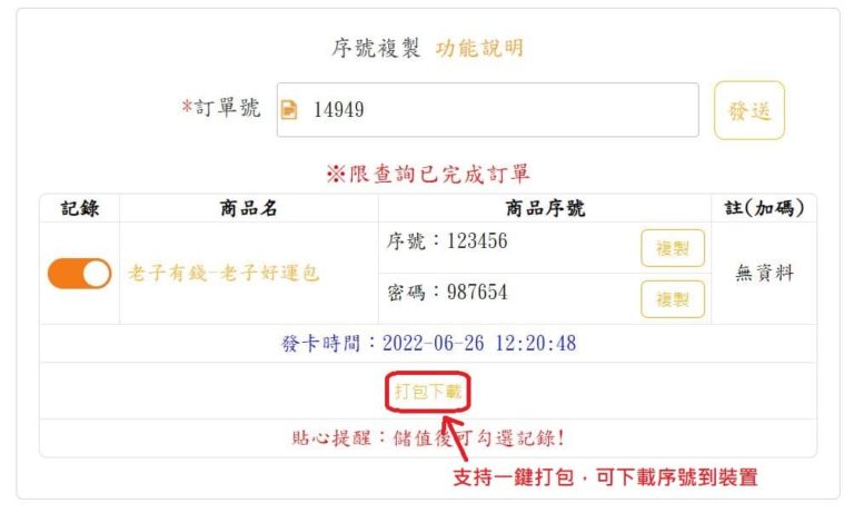 好下載功能:一鍵打包訂單內的序號及密碼,儲存到自己的裝置So easy。